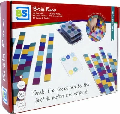 Brain Race brettspill fra BS Toys. Opp ned og ti lsidene. Flytt strimlene for å lage korrekt mønster. Legg kortet over på trimlene for å sjekke at du har gjort riktig! – CE-merket – Anbefalt alder: Fra 6 til 12 år
