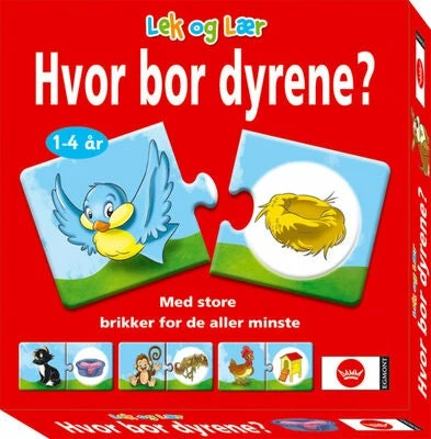 Damm Barnespill Hvor Bor Dyrene? Et enkelt spill for de aller minste, med store, tykke brikker som er lette å gripe for små barnehender.1-4 spillere.Anbefalt alder: 1-4 år.