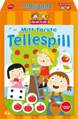 Mitt første tellespill er et morsomt spill fra Egmont. I dette underholdende barnespillet får barnet øve seg på å telle samtidig som dere leker. Kast terningene og tell alle prikkene. Finn deretter brikken med samme antall prikker og snu den. Hvis du finner et eple, får du plukke like mange epler som det er prikker! Den som samler flest epler vinner.Anbefalt alder: Fra 4 år.