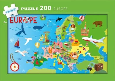 Et fint puslespill med motiv av et europakart. Puslespillet er laget av papp og har 200 brikker.