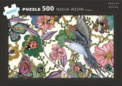 Et fint puslespill fra Kärnan, med 500 brikker. Puslespillet er laget av papp, og har motivet Budgies av Nadja Wedin.