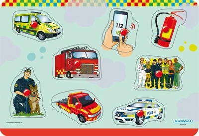 Dette er et flott puslespill med motiver av redningsetatene. Puslespillet består av åtte biter med knotter som gjør dem lette å legge i rammen. Bitene forestiller personale, brannbiler, politibiler og ambulanser. Perfekt for nysgjerrige barn!Anbefalt alder: fra 1,5 år.Mål: 4 x 19,5 x 18,5 cm.Antall biter: 8 stk.Materiale: tre.