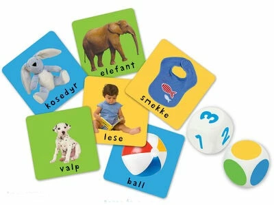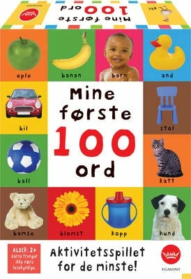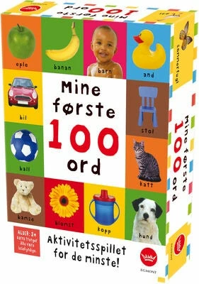 Mine 100 første ord er et morsomt ordspill fra Egmont. Legg kortene rundt omkring i rommet og kast en av terningene – enten fargeterningene eller terningen med tall. Finn deretter igjen kortet som matcher terningen, enten med riktig farge eller riktig antall kort. Barna vil kjenne igjen ordene på kortene mens de samler dem, og blir samtidig introdusert til enkel telling. Spillet oppmuntrer til interaktiv læring gjennom bevegelse og utforskning.Anbefalt alder: Fra 2 år.