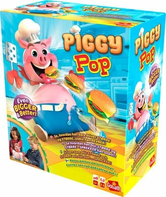 Pig Goes Pop, fra Goliath Games. Et spill som vil gi timevis med moro. Mat grisen, til den plutselig sprekker!Kast terningen og finn frem hamburgere i den viste fargen. Putt hamburgeren i munnen på grisen, trykk deretter grisens hode ned. Se på hvordan grisens mage blir større og større. Men pass på! Grisens mage vil sprekke etter hvert, da er du ute av spillet!Anbefalt alder: fra 4 år.