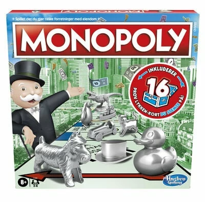 Det klassiske Monopolspillet i en oppdatert versjon, fra Hasbro. Spillet har fått et nytt utseende og en ny spillebrikke, som har blitt stemt frem av fans fra hele verden. Spillet går ut på at du raskt skal eie så mye som mulig, samtidig som motstanderne dine gir deg alle pengene deres. Mest er best, rett og slett!Anbefalt alder: fra 8 år.