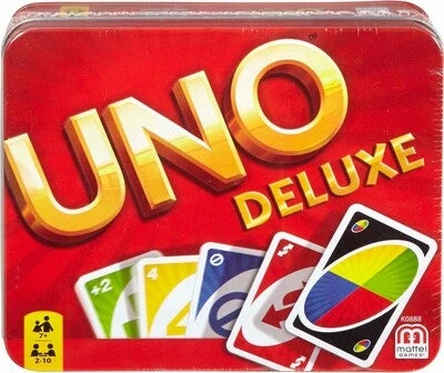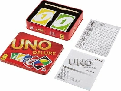 Populært UNO Deluxe brettspill fra Mattel med en beskyttende tinnboks. Det har 108 kort og instruksjoner. Brettspillet har en poengblokk og en penn. – Anbefalt alder: Fra 7 år