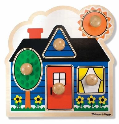 Melissa & Doug Puslespill Former, et morsomt puslespill som viser et fargerikt hus. Puslespillbitene har forskjellige former og er et godt verktøy for å trene barnet på hva som er forskjellen på en trekant, et rektangel, en sirkel osv. Et tykt trepuslespill med store treknotter, som er lette å gripe for små hender. Puslespillet oppmuntrer til hånd-øye-koordinering.Anbefalt alder: Fra 1 år.