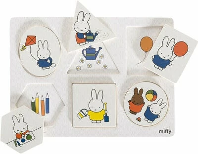 Et morsomt formpuslespill med den søte figuren Miffy! Puslebitene har ulike geometriske former og motiver, og har alle å gjøre med motivet på fordypningene der puslebitene skal legges. Et morsomt og passelig vanskelig puslespill for de minste!Anbefalt alder: 1 år +.Mål: 30 x 21 cm.Materiale: Tre.Farge: Hvit.