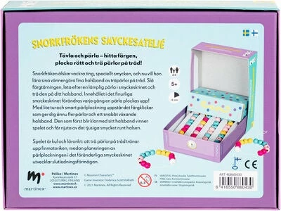 Snorkfrøkens smykkeatelier er et fint selskapsspill fra Mummitrollet. Spillet er både morsomt og lærerikt: finmotorikken og fantasien trenes opp når man velger hvilke perler som er smartest å plukke opp og tre på.Snorkfrøken elsker vakre ting, og nå vil hun lære vennene sine hvordan man lager vakre perlesmykker! Hver spiller har et halskjede som man prøver å fylle med så mange treperler som mulig. Det er viktig å velge fargen som terningene viser, og det er viktig å velge riktig – slik at du får flest mulig perler. Hver gang du tar en perle, endres innholdet i smykkemaskinen, ettersom flere perler faller ned. Spilleren med flest perler på halskjedet vinner!- 2-4 spillere.- Spilletid: ca 10 minutter.Anbefalt alder: fra 5 år