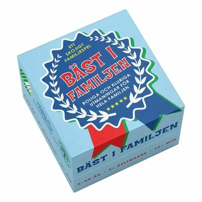 Best i familien er et morsomt selskapsspill fra Nicotex. Samle venner og familie og gjør disse morsomme utfordringene. Le når de voksne danser ballett eller hermer en vaskemaskin, eller når barna utfordrer hverandre i luftgitar, står på ett bein eller prøver å holde seg alvorlige i sinteleken. Hele familien kan være med – den som vinner utfordringen, beholder kortet og får poeng. Alder: 5-99 år.Antall spillere: 2 +. Spilletid: 15 min +.Innehold: 95 utfordringer, regler.