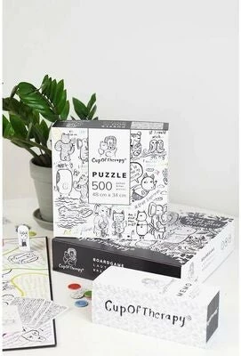 Et puslespill på 500 deler med sjarmerende illustrasjoner av Matti Pikkujämsä. De fleste bilder har også en kort tekst på engelsk, som den tøffe grisen i en Superman-kappe som sier «I’m not afraid to express my emotions».Cup Of Therapy er et konsept utviklet av de finske psykoterapeutene Antti Ervasti og Elina Rehmonen, hvor en kopp med empati, forståelse og takknemlighet serveres av en gjeng bedårende dyr. Vanskelige følelser og vanskelige temaer håndteres på en myk og lærerik måte.Puslespillet er miljøvennlig laget av resirkulert papp og når det er ferdig har det størrelsen 48 x 34 cm.