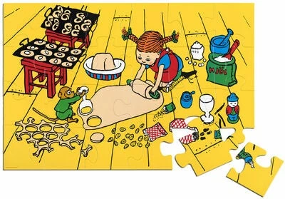 Et morsomt puslespill med Pippi Langstrømte-motiv. Illustrasjonen er av Ingrid Vang Nyman og viser Pippi og Herr Nilsson i full gang med å bake!Dette er et stort barnepuslespill, så man må legge det på gulvet!Anbefalt alder: 3 år +. Antall bilder: 24. Mål: 92 x 62 cm. Materiale: papp.