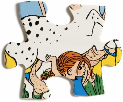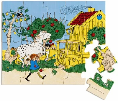Et kjempefint trepuslespill med Pippi Langstrømpe-motiv! Illustrasjonen er av Ingrid Vang Nyman, og den viser Pippi som bærer på hesten Lilla Gubben. Også Tommy og Annika titter frem bak fra bak gjerdet!Barnepuslespillet har 20 brikker og leveres i en fin eske som også rommer puslespillet når det er ferdig lagt!Anbefalt alder: 3 år +.Antall biter: 20. Mål: 22 x 18 cm. Materiale: kryssfiner.