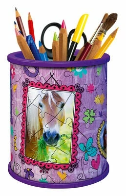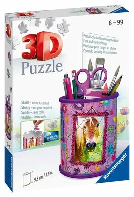 Et heftig 3D-puslespill med 54 brikker, fra Ravensburger. Puslespillet er designet som et pennestativ, med et fint hestemotiv! Oppdag et unikt og morsomt puslespillkonsept. Med Easy Click-teknologi passer de individuelt formede og fleksible puslespillbrikkene nøyaktig sammen – du trenger ikke noe lim! Et morsomt puslespill for hele familien, som også kan brukes etter at det er ferdig satt sammen! Anbefalt alder: fra 6 år.