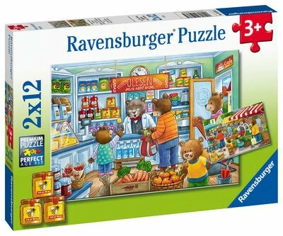 To puslespill i ett fra Ravensburger, med fine motiver med en bjørnefamilie som er på butikken. Her får barnet ditt to puslespil, med 12 biter i hvert. Barnepuslespill er en god måte for de små å trene opp gjenkjenning, logisk tenkning, tålmodighet og øye/hånd-koordinasjon, samtidig som de kan more seg! Brikkene har en gunstig størrelse og en vanskelighetsgrad tilpasset aldersgruppen. – Ravensburger har utviklet puslespill siden 1891. – Puslespillet inneholder totalt 24 biter. Anbefalt alder: 3 år +.