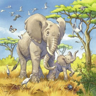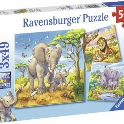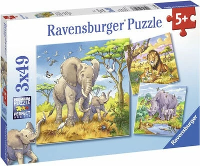 Tre puslespill i ett fra Ravensburger, med motiver av ville dyr. Hvert puslespill består av 49 brikker med motiver av neshorn, elefanter og løver. Legg alle brikkene på plass og se motivet komme frem!Puslespill for barn er en fin måte for barnet ditt å øve på gjenkjennelse, logisk tenkning, tålmodighet og øye / håndkoordinering, samtidig som barnet har det gøy! Brikkene har en strategisk størrelse og tilpasset vanskelighetsgrad for aldersgruppen. Med riktig tilpasset vanskelighetsgrad styrkes både barnets selvtillit og korttidshukommelse.Anbefalt alder: Fra 5 år.