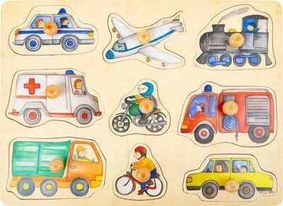 Skal du fly eller kjøre bil? Dette robuste trepuslespillet fra Small Foot, inneholder nydelig illustrerte puslespillbrikker med treknotter. Puslespillbrikkene er lette å gripe for små barn og plasseres enkelt i den utskårne rammen. Puslespillet utvikler barnets tålmodighet og finmotorikk på en leken måte.