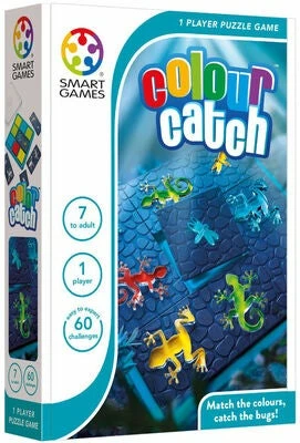 Color Catch, fra SmartGames. Spillet går ut på å matche fargene, etterpå kan man fange insektene! Plasser alle brikkene på spillebrettet slik at froskene, øglene og insektene samsvarer med fargene som vises i utfordringen. Med 60 utfordringer, som bare blir vanskeligere og vanskeligere jo mer du spiller!Anbefalt alder: Fra 7 år.