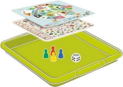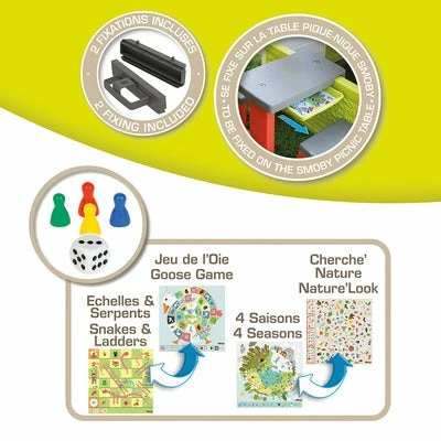 Et sett med barnespill og en terning, fra Smoby. Spillet er designet i Frankrike. Det har to dobbeltsidige brett. – 4 Brikker – CE-merket – Anbefalt alder: fra 3 år