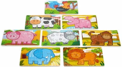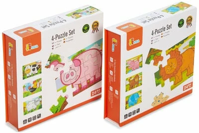 VIGA Trepuslespill med motiv av dyr inneholder 4 morsomme puslespill. De fire puslespillene kan også settes sammen til et langt puslespill.Til sammen har puslespillet 48 brikker, som kommer med et robust oppbevaringsbrett av tre med høy kvalitet. Med dette flotte puslespillet får barnet ditt et større verdensbilde.Anbefalt alder: fra 2 år.